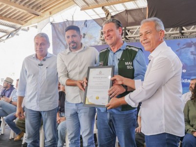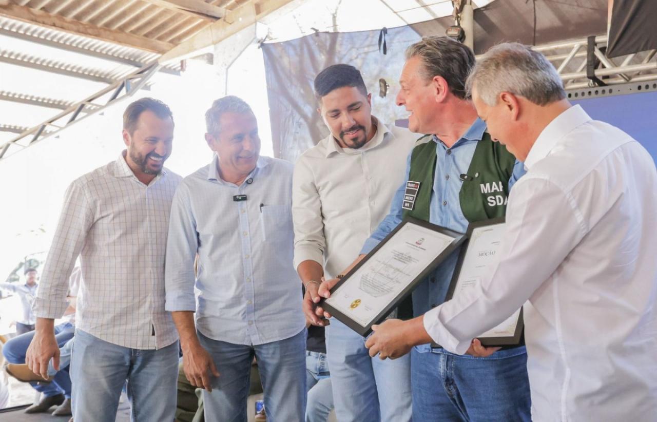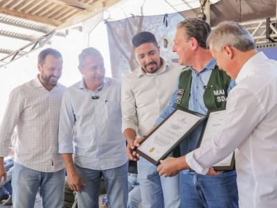 A manhã desta sexta-feira (11) foi histórica para o município de Sorriso. No assentamento Jonas Pinheiro, o ministro da Agricultura, Pecuária e Abastecimento, Carlos Fávaro, recebeu o título de Cidadão Sorrisense e uma moção de aplausos da Câmara Municipal, em reconhecimento aos serviços prestados à cidade durante sua trajetória como senador e no Governo Federal. A solenidade ocorreu durante a entrega de equipamentos e maquinários do Programa de Agricultura Familiar para produtores de Sorriso e região.