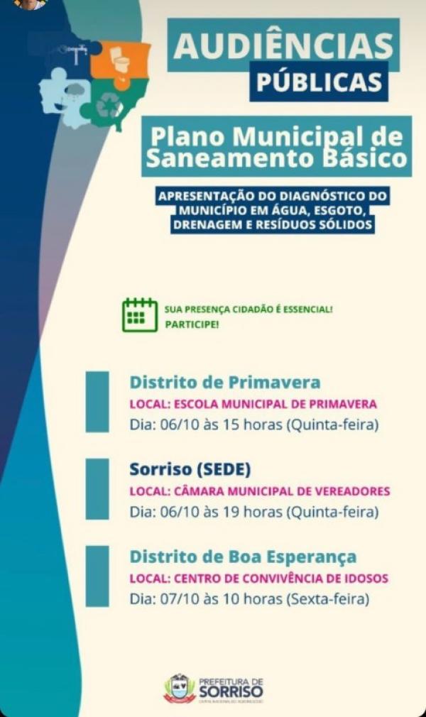 Quer saber como está o saneamento básico em Sorriso? Você tem interesse em participar do processo de construção do Plano Municipal de Saneamento Básico (PMSB) dentro do horizonte dos próximos 20 anos? Então anote aí: na próxima semana, a Prefeitura promoverá três audiências públicas em que será apresentado o Diagnóstico Técnico-Participativo, um dos ingredientes do PMSB.