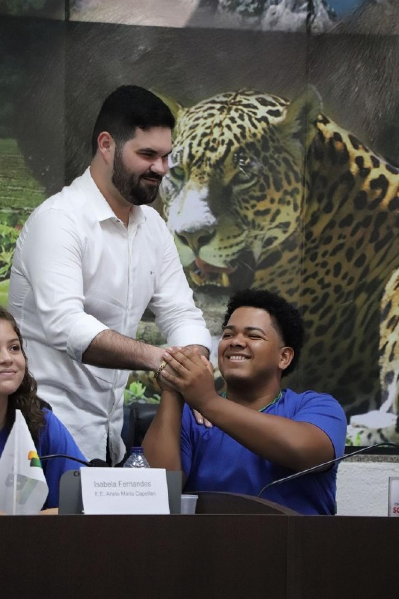 Logo no início da sessão, o vereador Acacio Ambrosini falou aos jovens parlamentares sobre a importância da atuação jovem na sociedade e sobre a responsabilidade do cargo que assumiram como jovens parlamentares.